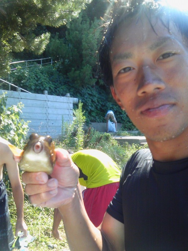 私もふぐを捉え、納得のドヤ顔です。(食えないし、あとすごく元気だったのでその後リリースしました)